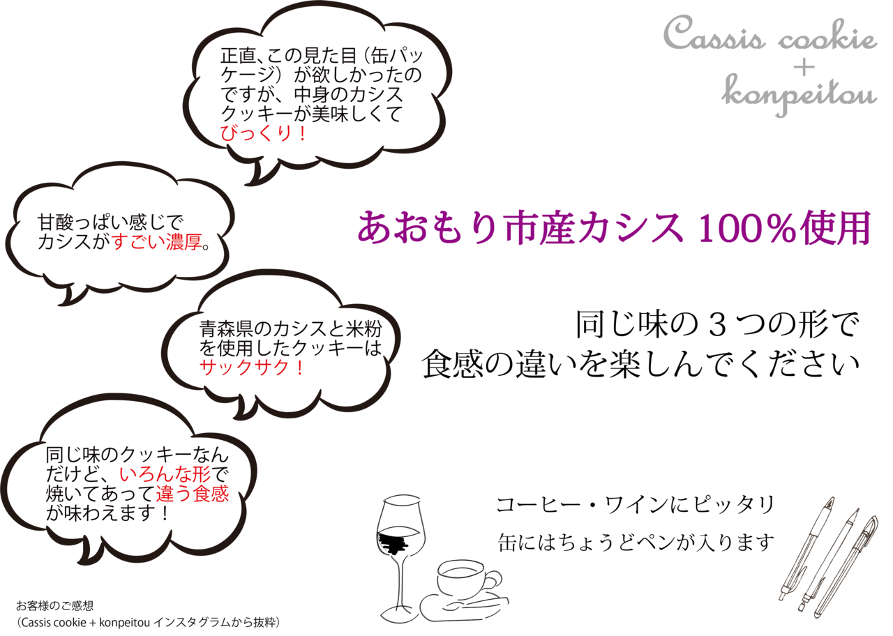 カシス(果実)の紫色が白い金平糖により際立つ、あおもりカシスの米粉クッキーです。3つの形のさくっと食感が特徴のクッキーです。小麦粉を使わずに、青森県産米粉を使用しております。