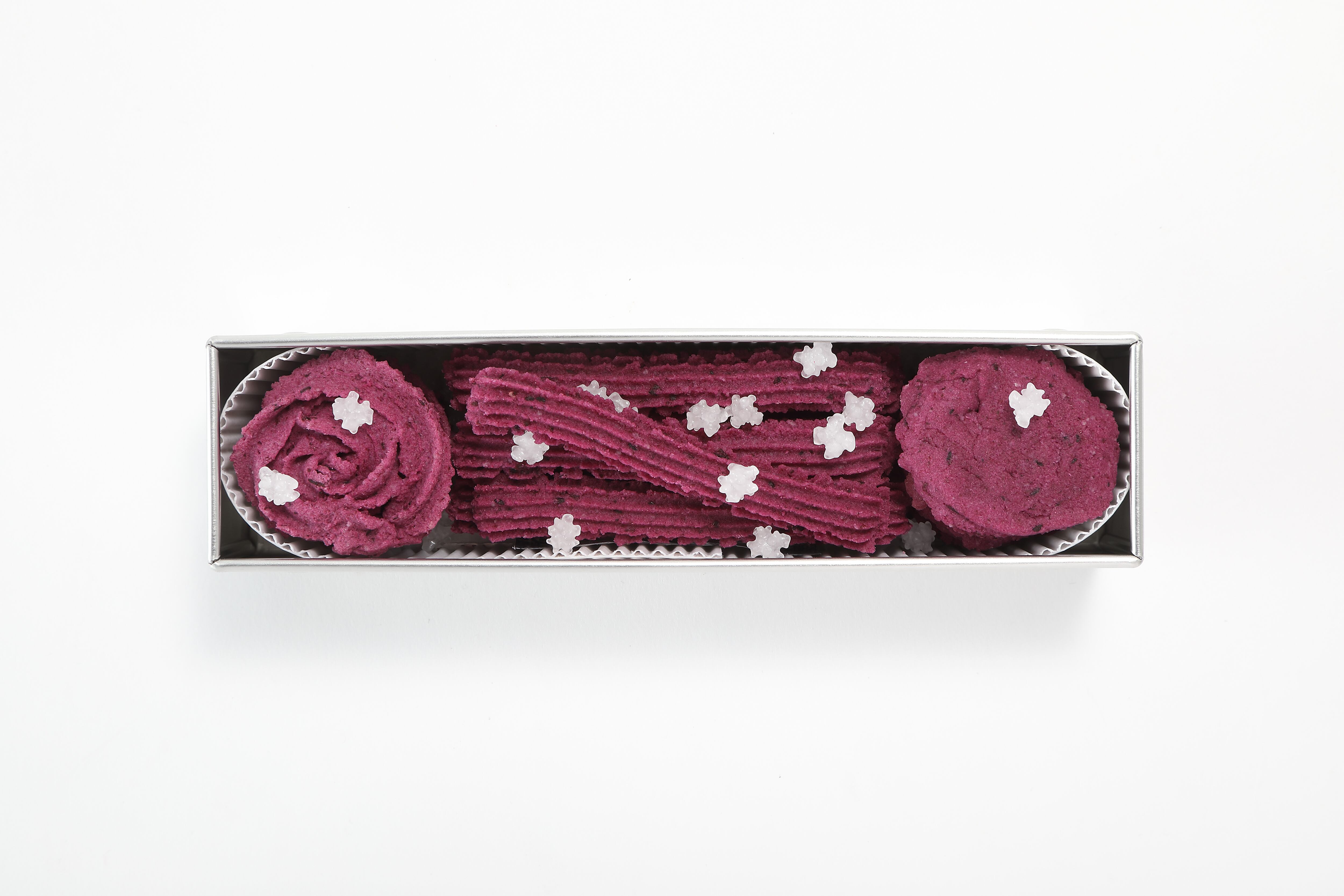 カシス(果実)の紫色が白い金平糖により際立つ、あおもりカシスの米粉クッキーです。3つの形のさくっと食感が特徴のクッキーです。小麦粉を使わずに、青森県産米粉を使用しております。